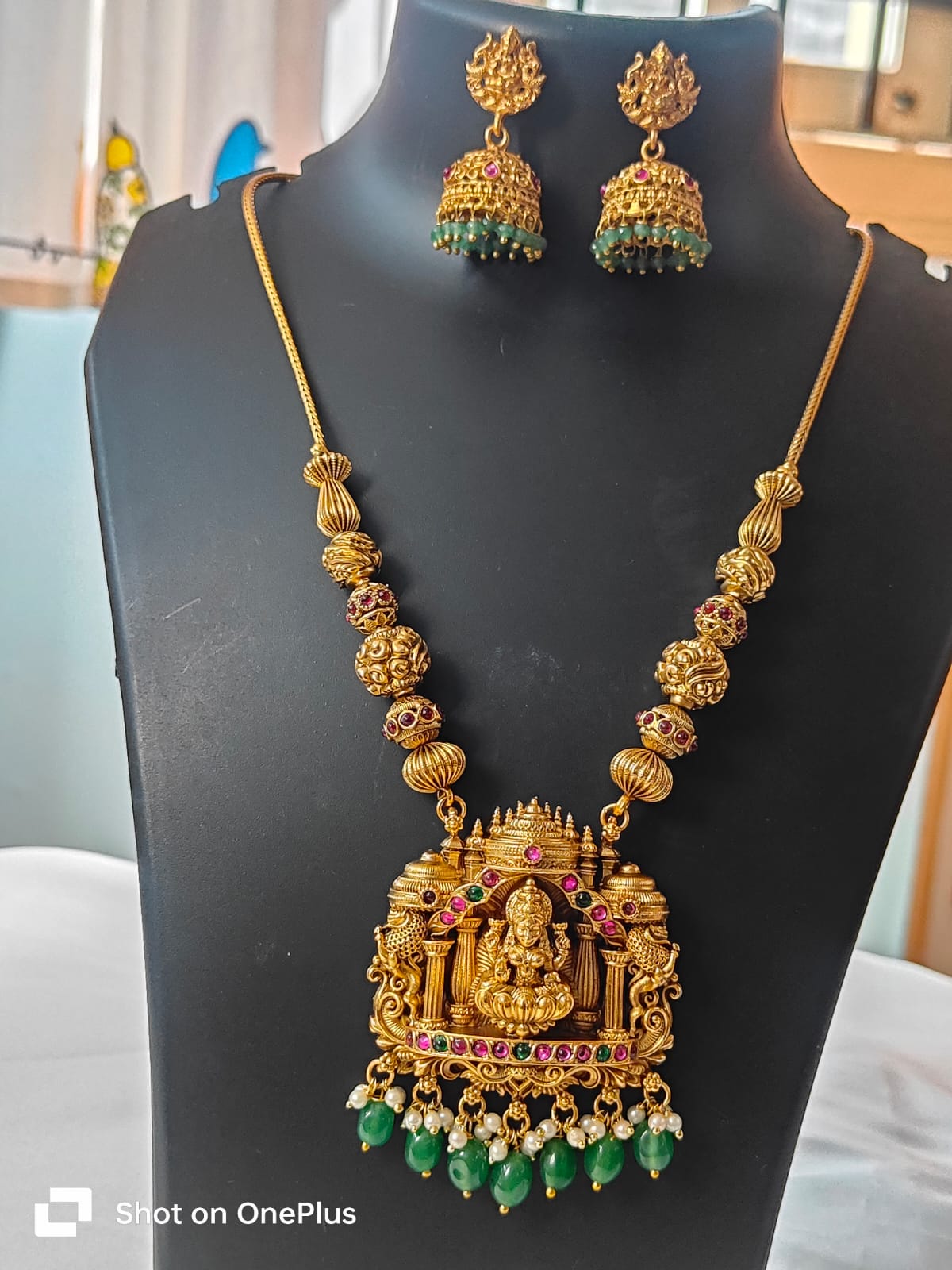 DI620 This stunning set features a gold plated necklace with a Devi pendant adorned with green and red gemstones, complemented by matching earrings Free size