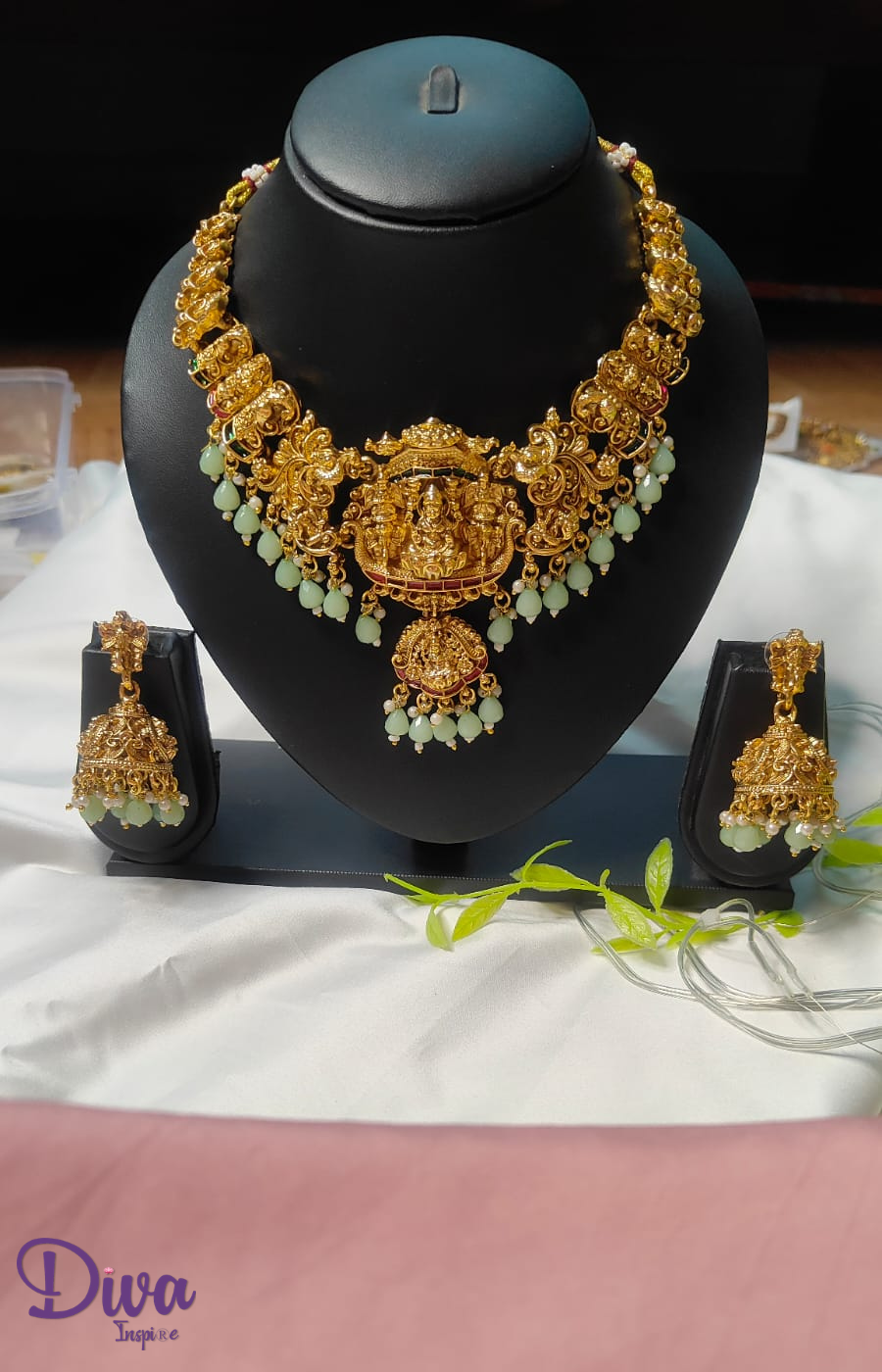 DI6465 Rajamata Temple Heritage primium Necklace grand temple Lakshmi set with green bead drops